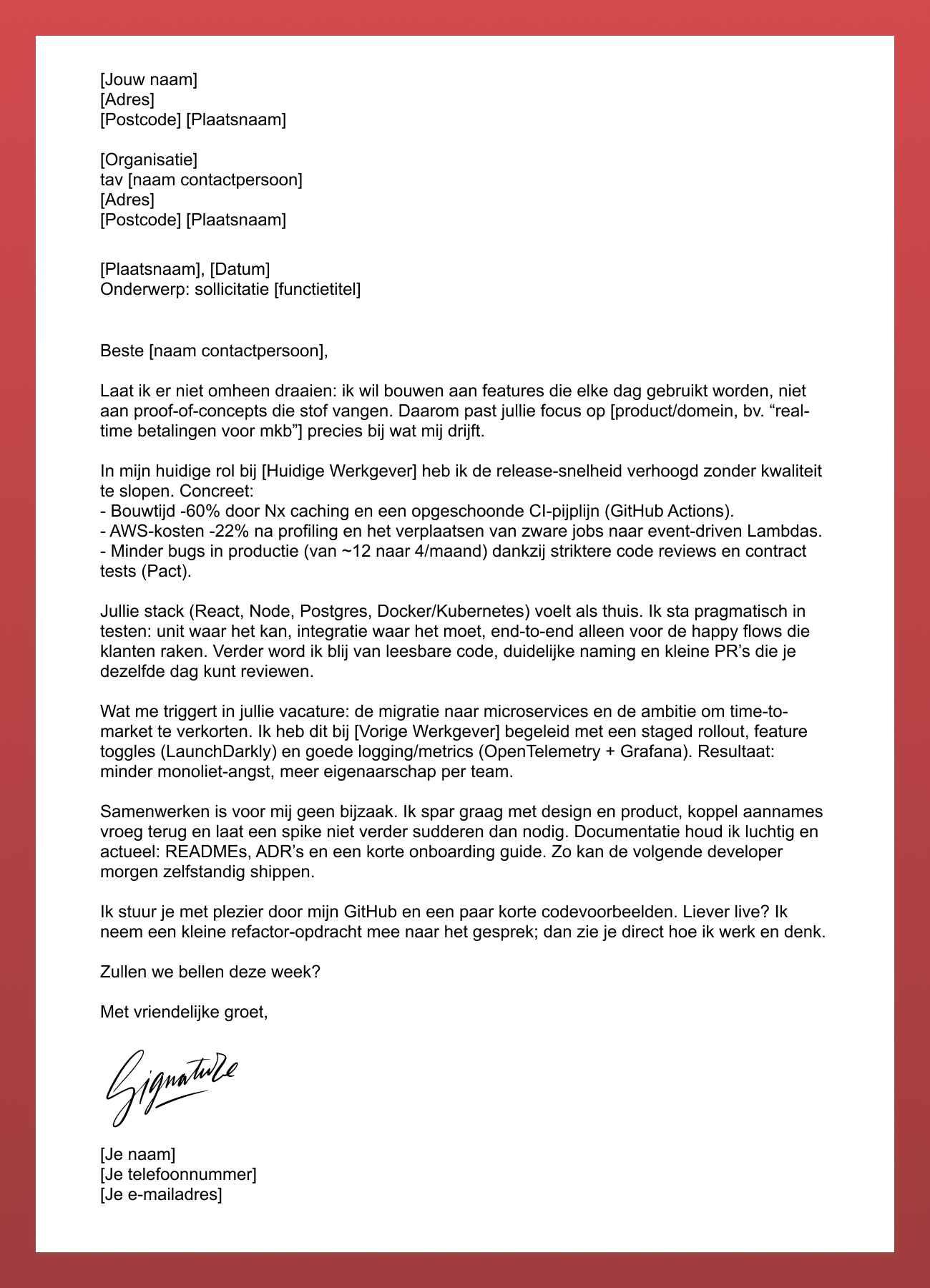 Noem wanneer je beschikbaar bent en stel een concreet vervolgstapje voor (“korte call”, “live code-review”). Bereid alvast vragen voor uit dit overzicht: sollicitatiegesprek vragen. Lees meer over een goede afsluiting van je brief.