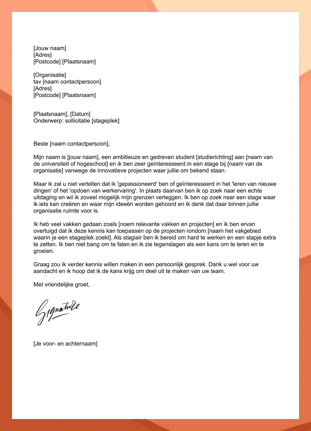 Beste [naam van de contactpersoon], Mijn naam is [jouw naam], een ambitieuze en gedreven student [studierichting] aan [naam van de universiteit of hogeschool] en ik ben zeer geïnteresseerd in een stage bij [naam van de organisatie] vanwege de innovatieve projecten waar jullie om bekend staan. Maar ik zal u niet vertellen dat ik 'gepassioneerd' ben of geïnteresseerd in het 'leren van nieuwe dingen' of het 'opdoen van werkervaring'. In plaats daarvan ben ik op zoek naar een echte uitdaging en wil ik zoveel mogelijk mijn grenzen verleggen. Ik ben op zoek naar een stage waar ik iets kan creëren en waar mijn ideeën worden gehoord en ik denk dat daar binnen jullie organisatie ruimte voor is. Ik heb veel vakken gedaan zoals [noem relevante vakken en projecten] en ik ben ervan overtuigd dat ik deze kennis kan toepassen op de projecten rondom [noem het vakgebied waarin je een stageplek zoekt]. Als stagiair ben ik bereid om hard te werken en een stapje extra te zetten. Ik ben niet bang om te falen en ik zie tegenslagen als een kans om te leren en te groeien. Graag zou ik verder kennis willen maken in een persoonlijk gesprek. Dank u wel voor uw aandacht en ik hoop dat ik de kans krijg om deel uit te maken van uw team. Met vriendelijke groet, [Jouw naam]