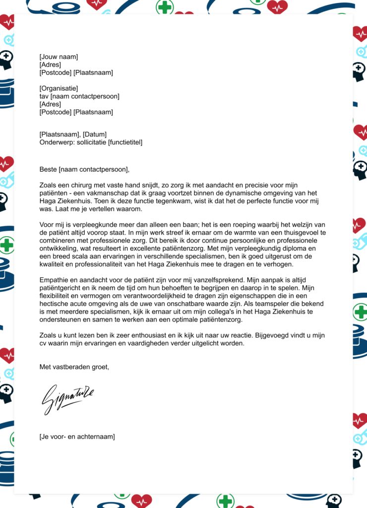 Beste [naam contactpersoon], Zoals een chirurg met vaste hand snijdt, zo zorg ik met aandacht en precisie voor mijn patiënten - een vakmanschap dat ik graag voortzet binnen de dynamische omgeving van het Haga Ziekenhuis. Toen ik deze functie tegenkwam, wist ik dat het de perfecte functie voor mij was. Laat me je vertellen waarom. Voor mij is verpleegkunde meer dan alleen een baan; het is een roeping waarbij het welzijn van de patiënt altijd voorop staat. In mijn werk streef ik ernaar om de warmte van een thuisgevoel te combineren met professionele zorg. Dit bereik ik door continue persoonlijke en professionele ontwikkeling, wat resulteert in excellente patiëntenzorg. Met mijn verpleegkundig diploma en een breed scala aan ervaringen in verschillende specialismen, ben ik goed uitgerust om de kwaliteit en professionaliteit van het Haga Ziekenhuis mee te dragen en te verhogen. Empathie en aandacht voor de patiënt zijn voor mij vanzelfsprekend. Mijn aanpak is altijd patiëntgericht en ik neem de tijd om hun behoeften te begrijpen en daarop in te spelen. Mijn flexibiliteit en vermogen om verantwoordelijkheid te dragen zijn eigenschappen die in een hectische acute omgeving als de uwe van onschatbare waarde zijn. Als teamspeler die bekend is met meerdere specialismen, kijk ik ernaar uit om mijn collega's in het Haga Ziekenhuis te ondersteunen en samen te werken aan een optimale patiëntenzorg. Zoals u kunt lezen ben ik zeer enthousiast en ik kijk uit naar uw reactie. Bijgevoegd vindt u mijn cv waarin mijn ervaringen en vaardigheden verder uitgelicht worden. Met vriendelijke groet, [Je naam]